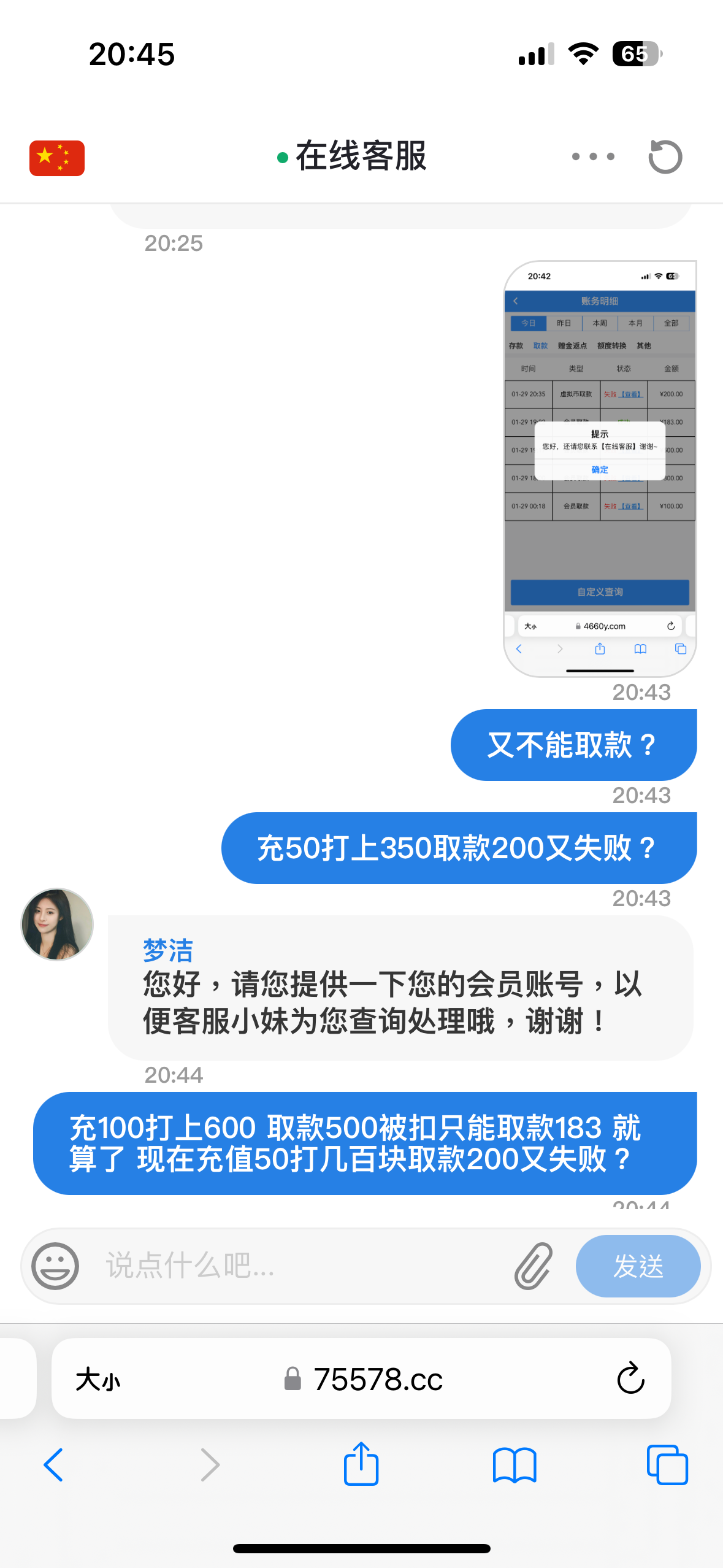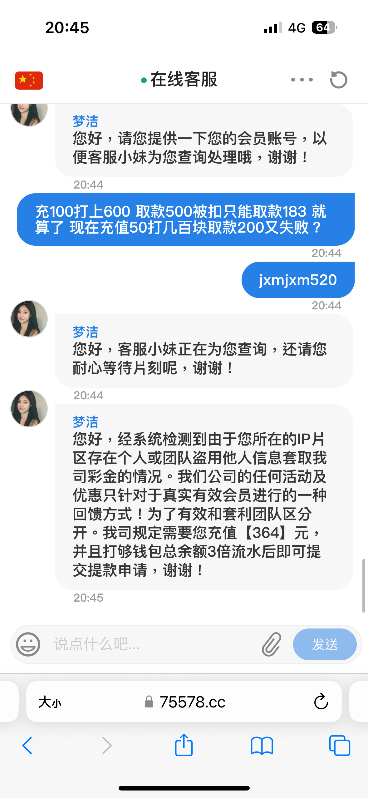 刚开始签到9块打水500提现退回 客服说充值100才能提现 充值了100提现500又全部扣剩下183 说只能提183 好嘛提183就183 没过一会充50打上350提现两百又被退回 结果又说要充值350加上账号上的350打3倍水 这尼玛真没格局 真的出生平台