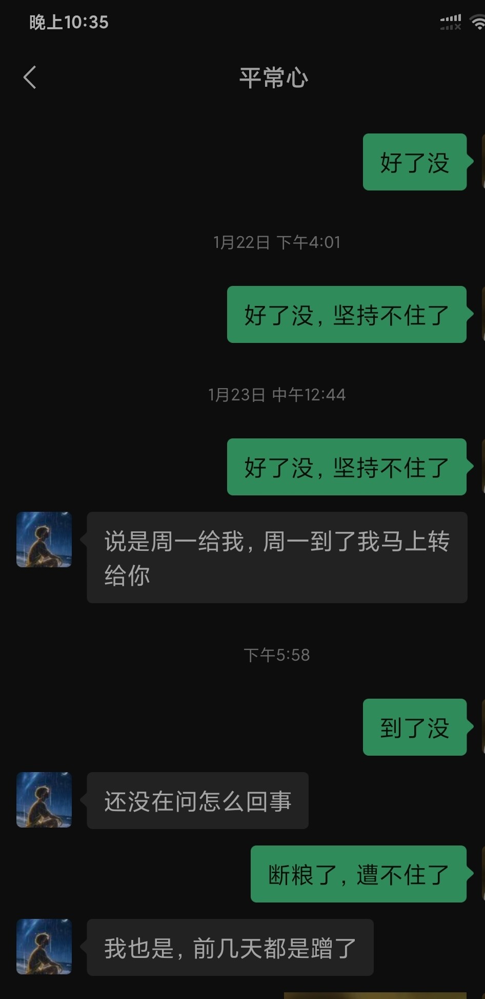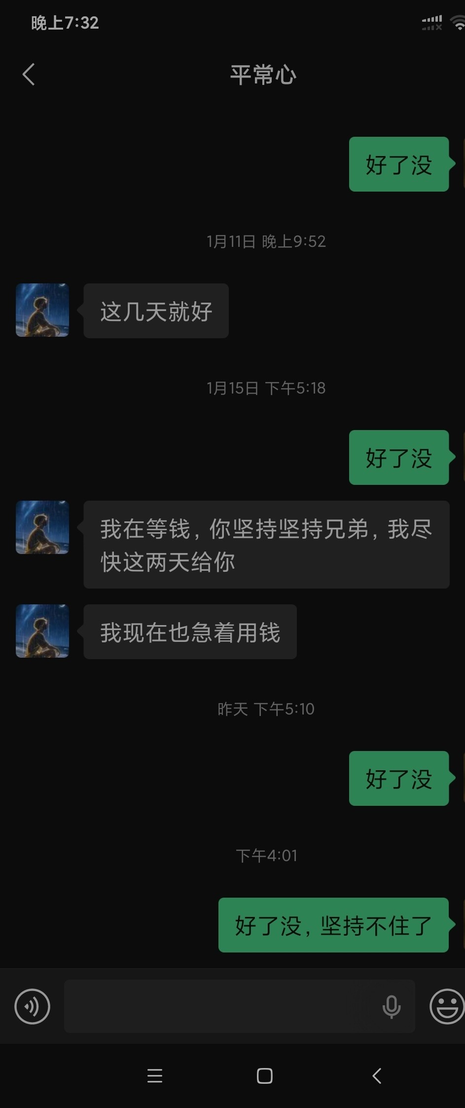 消息也不回了,回消息就是过几天这几天,然后就是给不出来,兄弟们这种是不是打定主意不还了