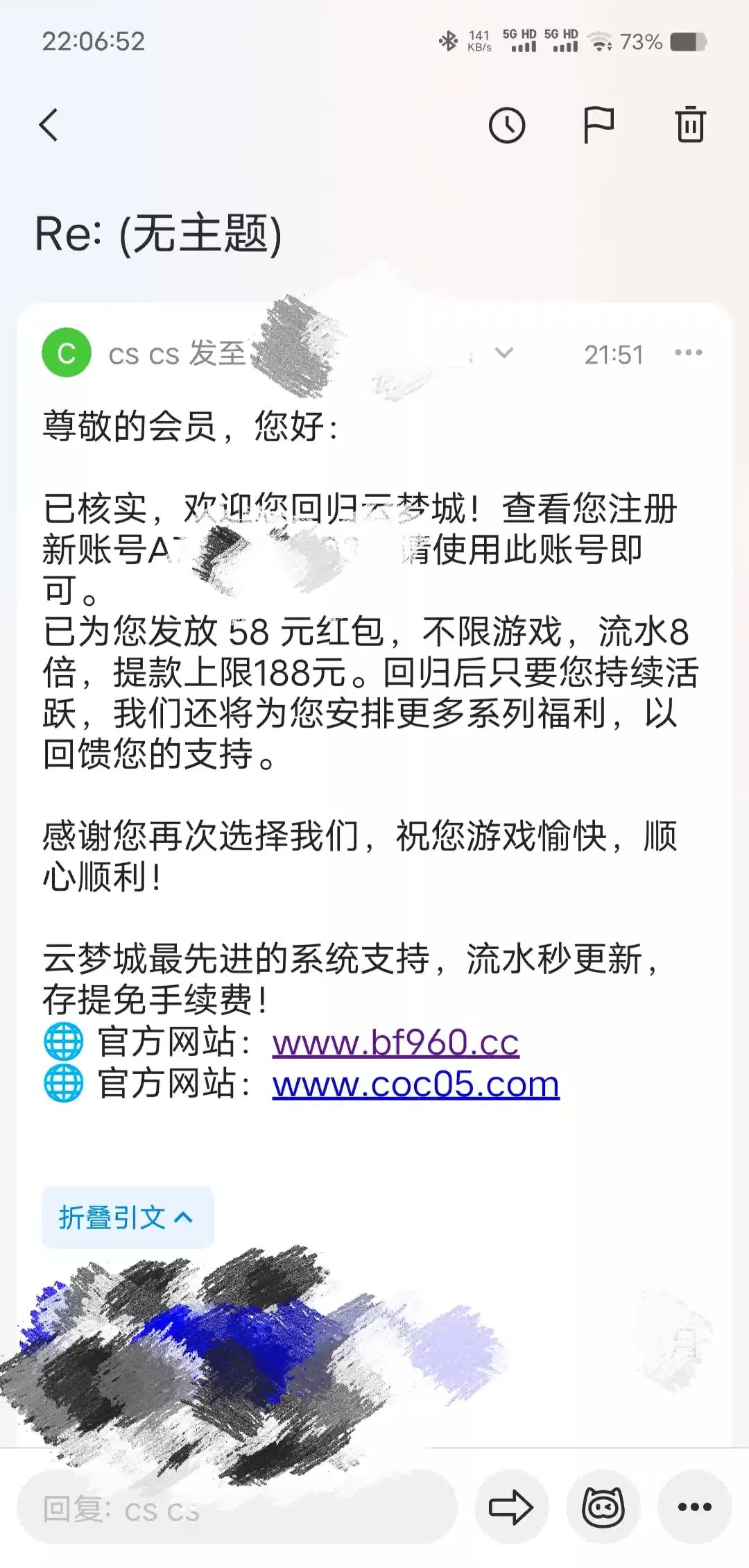 88bf/云梦城有号的发邮件碰瓷回归彩金,没有收到这个邮件的也可以试试,给了58。请发送 原账号信息(手机邮箱姓名)至:cs@coc99.net