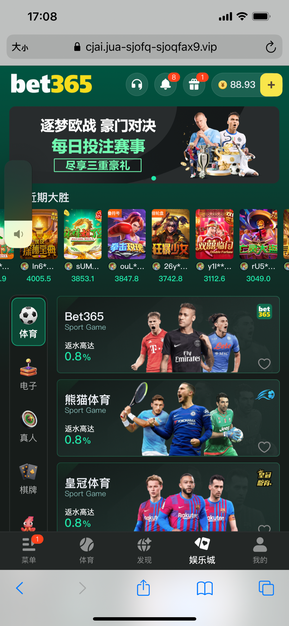 打开网站有余额的,可能以前就送过彩金吧。没存过,今天打电话说送我彩金,放下电话发现送了88没有限制游戏,要三倍流水,出款120美滋滋吃牛蛙去了。这几天一直没有接过骚扰电话,这是最近接的第一个。有点后悔,我是不是错过了一个亿。