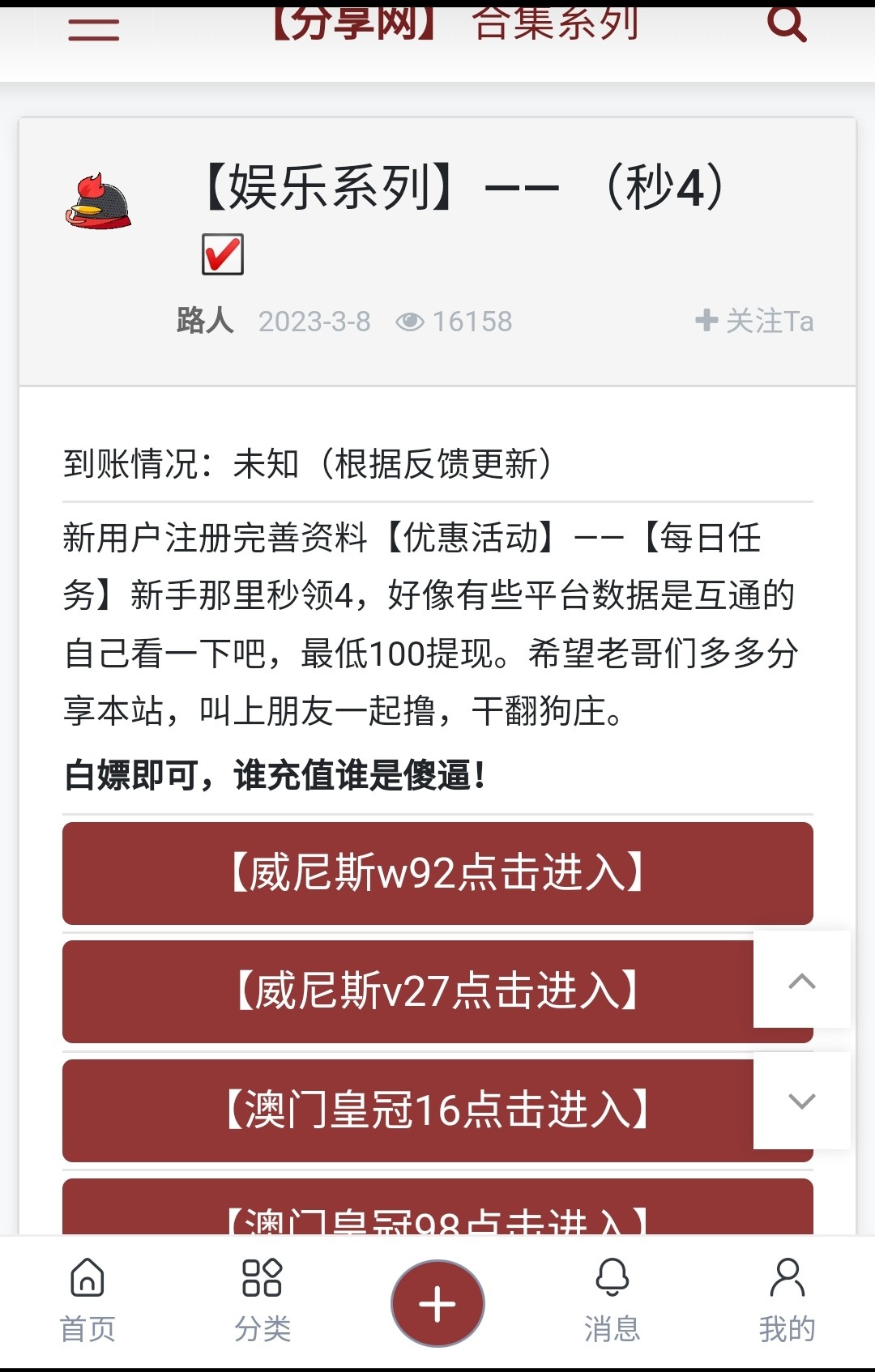 分享网致力打造全网最大的白嫖论坛,与狗庄斗智斗勇,让海外各大平台公司头痛畏惧,我们打击了狗庄嚣张气焰破坏,狗庄国内生存环境做出一份力量,如他人需要请把我们的“家”分享给更多需要的老哥。