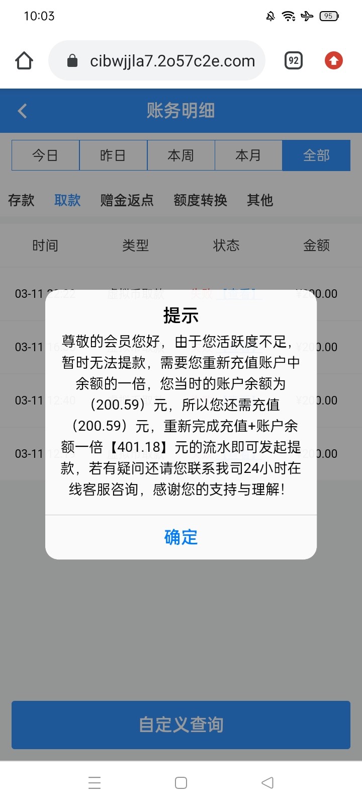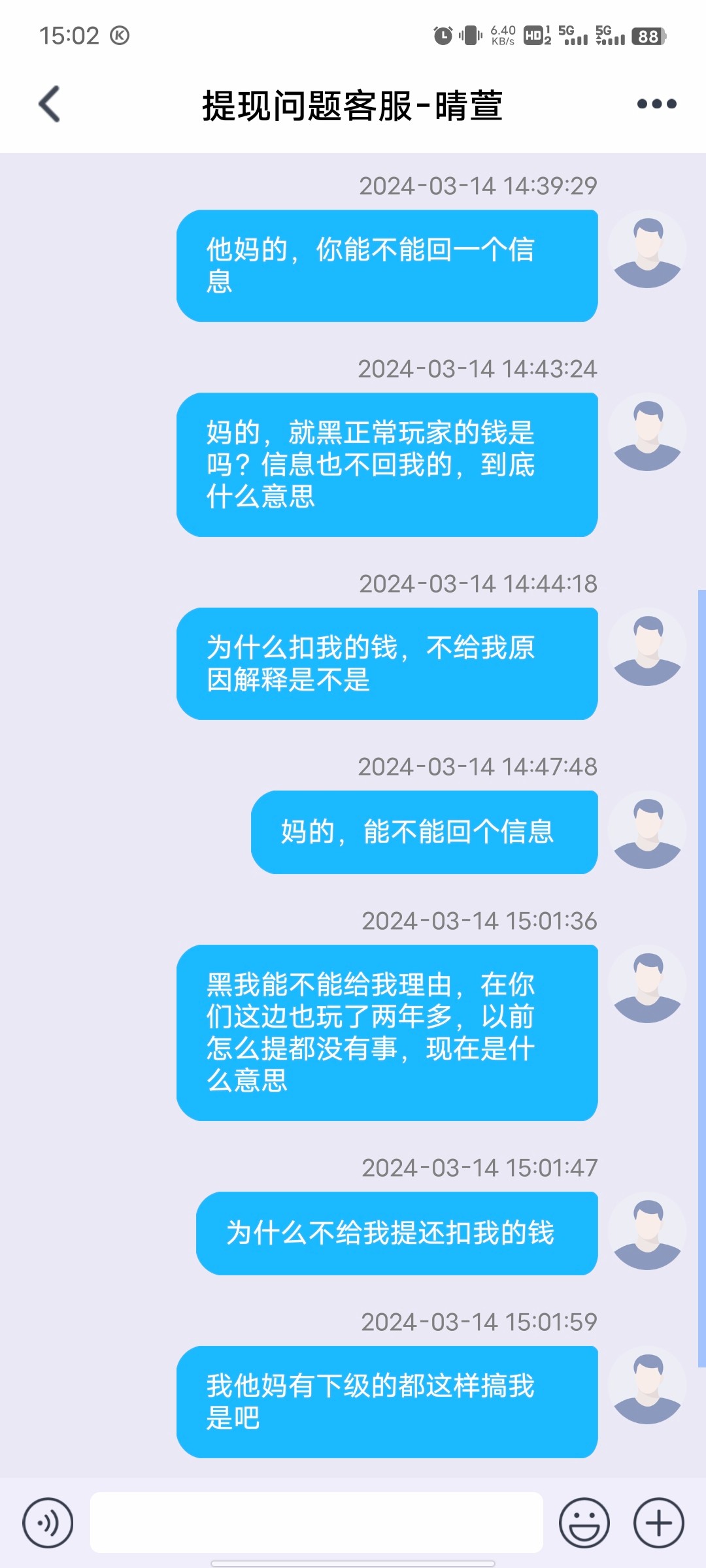 他妈的,送了58打了三天一万多流水,上过3500就是不给你出款死逼黑台一个一直让你打流水