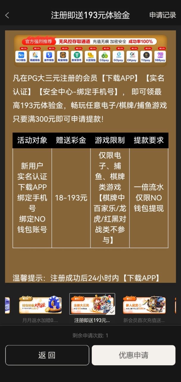 新用户下载APP注册完善资料绑定NO钱包优惠活动里自助申请18~193彩金限制电子捕鱼棋牌最低300提现