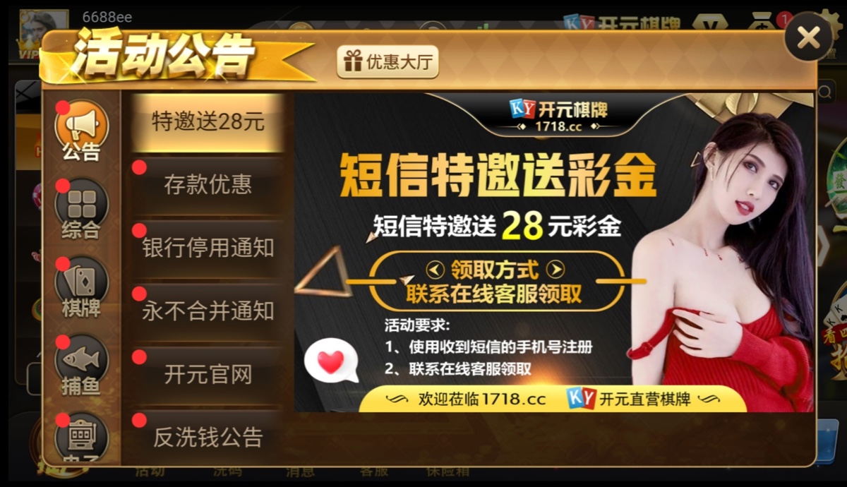 新用户注册完善资料,联系客服申请特邀彩金28,直接发手机号还有ID过去,不用短信。但是查特邀名额,反正我没有收到短信也送了。就算不送也没关系多注册这种平台特邀短信才多。