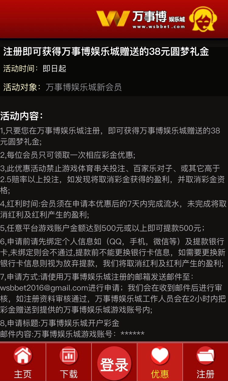 活动:新用户注册绑卡完善个人信息,按照活动要求发送邮箱申请38彩金,最低500起提,具体自测