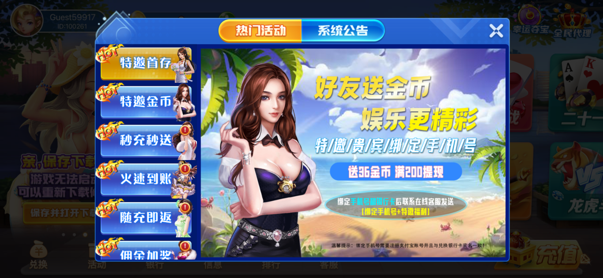 特邀用户下载完善资料找客服领36,跟贪玩娱乐是一个模板。基本每个人都送。如果不符合特邀也可以申请注册送18。申请过特邀彩金的,过一段时间去还可以申请,但是不要让客服发现要不然被封号。首存100送58推荐玩财神到2,手机号多的换IP无限撸,