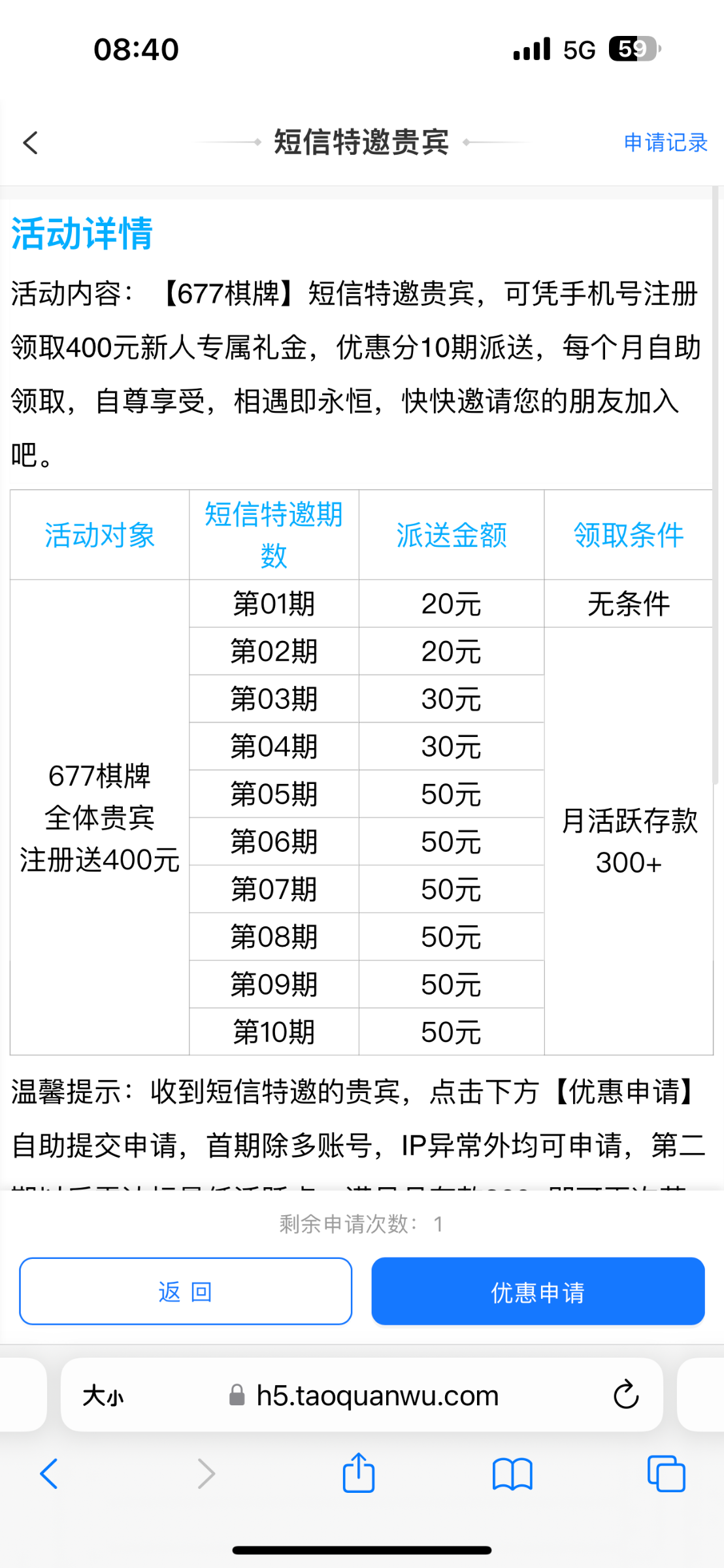 特邀碰瓷注册优惠活动里找到短信特邀自助申请20