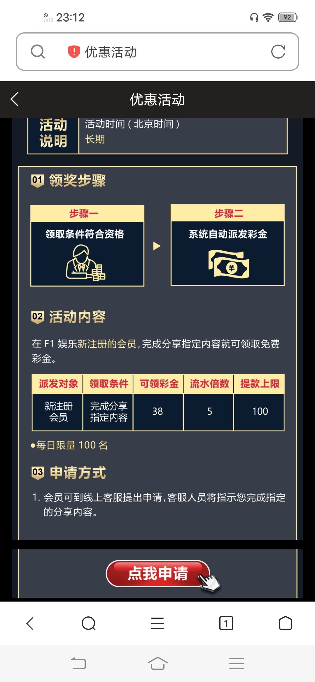 每天100名额,分享朋友圈送38彩金,自己蹲点抢,会p图自己p图试试。