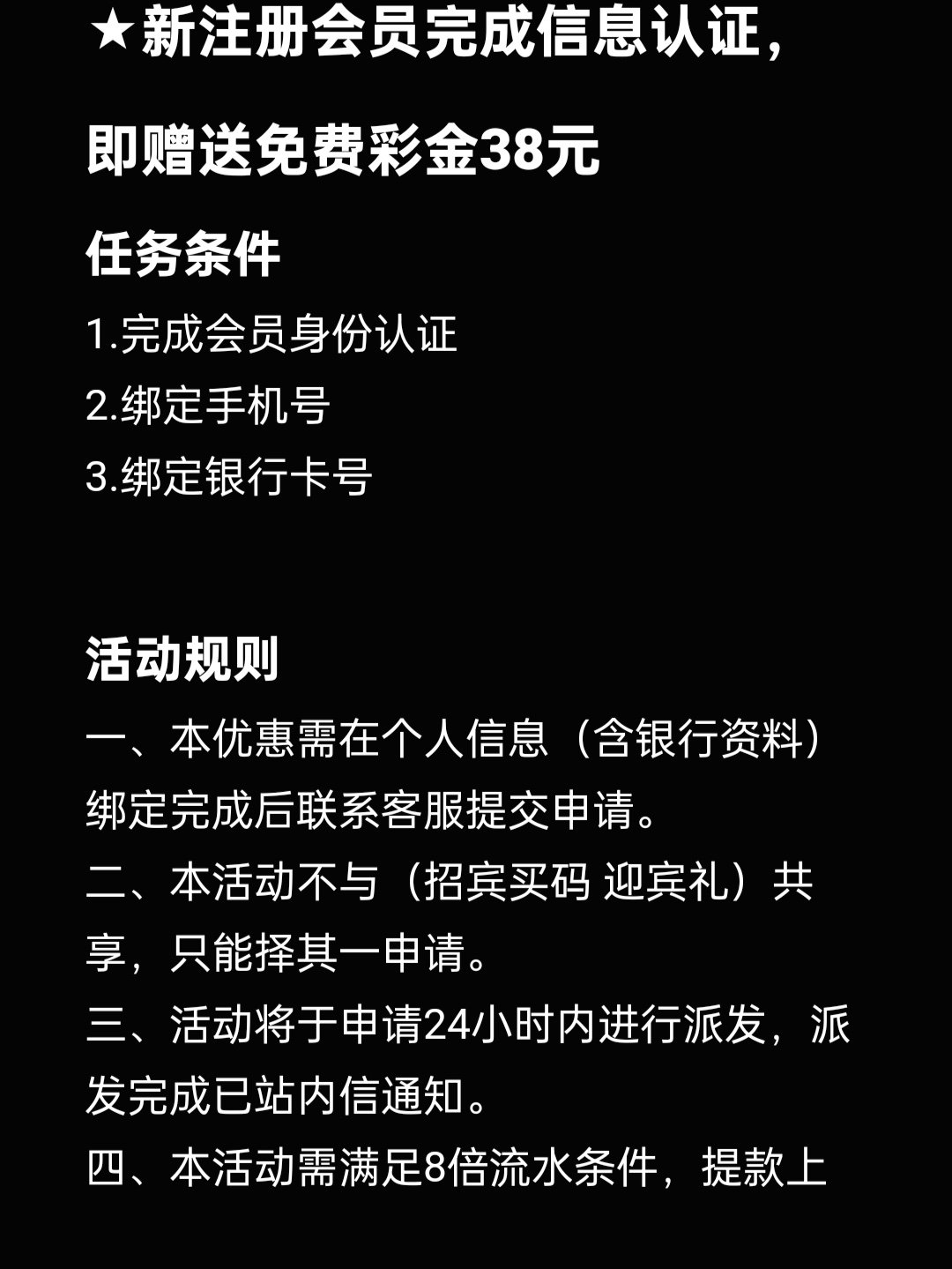 新用户注册绑定手机号yhk等信息找在线客服申请38注册彩金,8倍流水188提现。具体自测切记勿充值