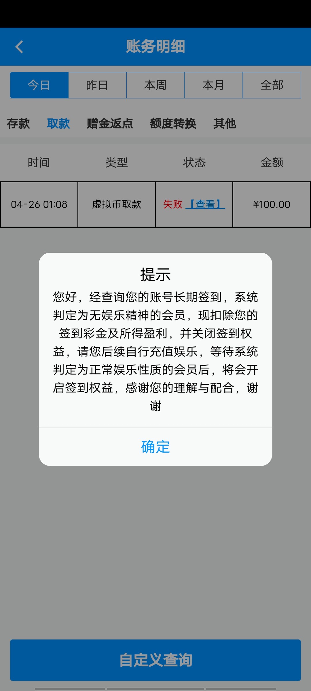 蚊子 你没有理解我的意思,比如你几天前冲过一笔钱,然后昨天靠签到彩金赢了钱,提现了,今天又靠签到彩金赢钱,是不可能给你提现的,你要在充值才可以,签到彩金赢的钱是不能给你连续提现的,除非你在这个平台输多了