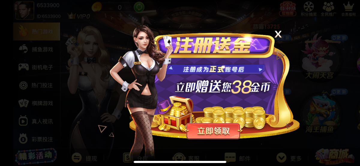 新用户注册绑定手机号秒送38,100提现,好像可以玩红包扫雷,其他游戏要50进场  禁止充值