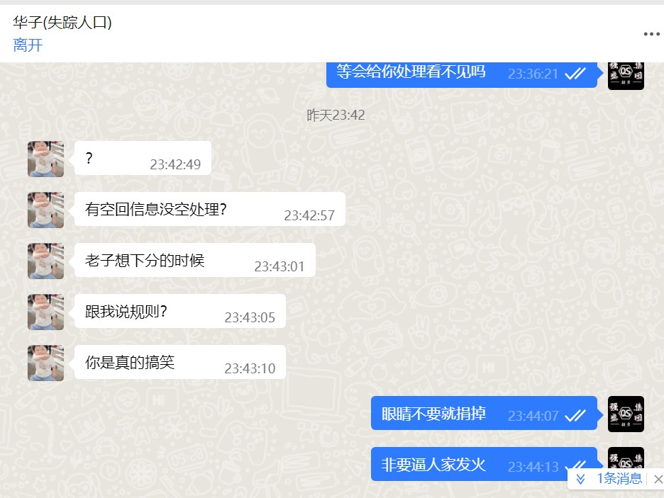 由于当时正值娱乐高峰期,接单已多次向此人作出回复“晚点”安排,但“王俭”却仍然不依不饶,像打了鸡血恶言恶语,且事后在动态公然诽谤造谣污蔑本群,妄图扭曲事实为自己牟利!
