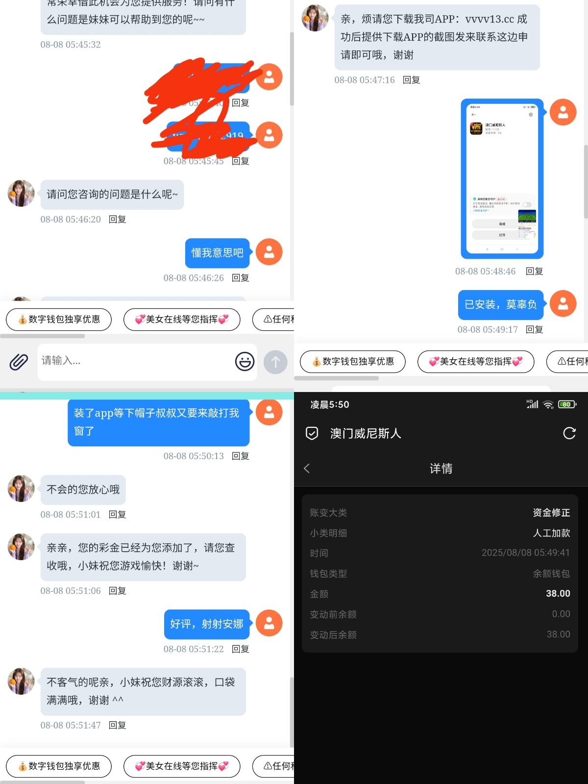 不知道跟vvv7是不是一家。注册完了等一段时间找客服发电话号码跟账号,我是很久以前2月份接到短信注册的,那时候啥也不送。不要傻戳戳刚注册就去找人家要电话彩金,要不到就骂人家客服,搞黄了大家都没得吃!