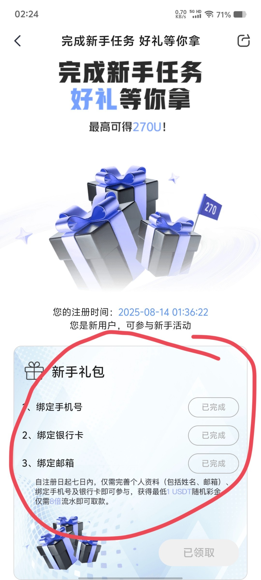 完成新手任务可以奖励,完成绑定手机号获得1u,完成绑定银行卡获得1u,完成绑定邮箱随机抽1u-270u