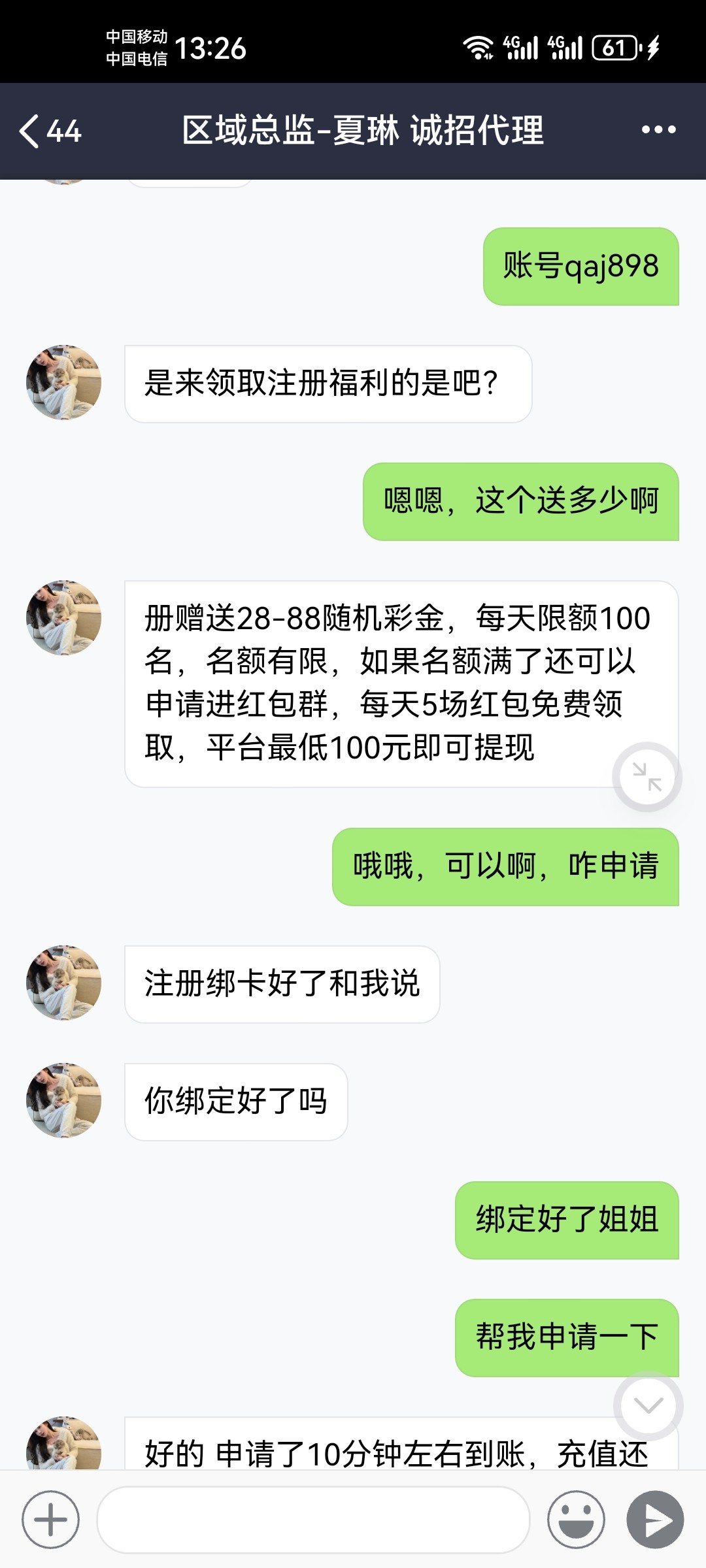 他红包好大,代理刚刚给我看的截图,不用充值快去抢