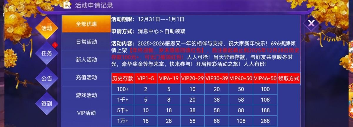 网址 696.tc  历史充值过的今天晚上8点可以领回馈,领多少看图,没充值过的不用去了,另外如果优惠封了去发邮箱反馈,我原来是捕鱼以小博大的时候给的彩金老打棋牌被封了优惠,后来自己发邮箱反馈申诉,发了邮箱之后让我充值打活跃度我就没吊他,结果隔了一段时间上去就自己解开了