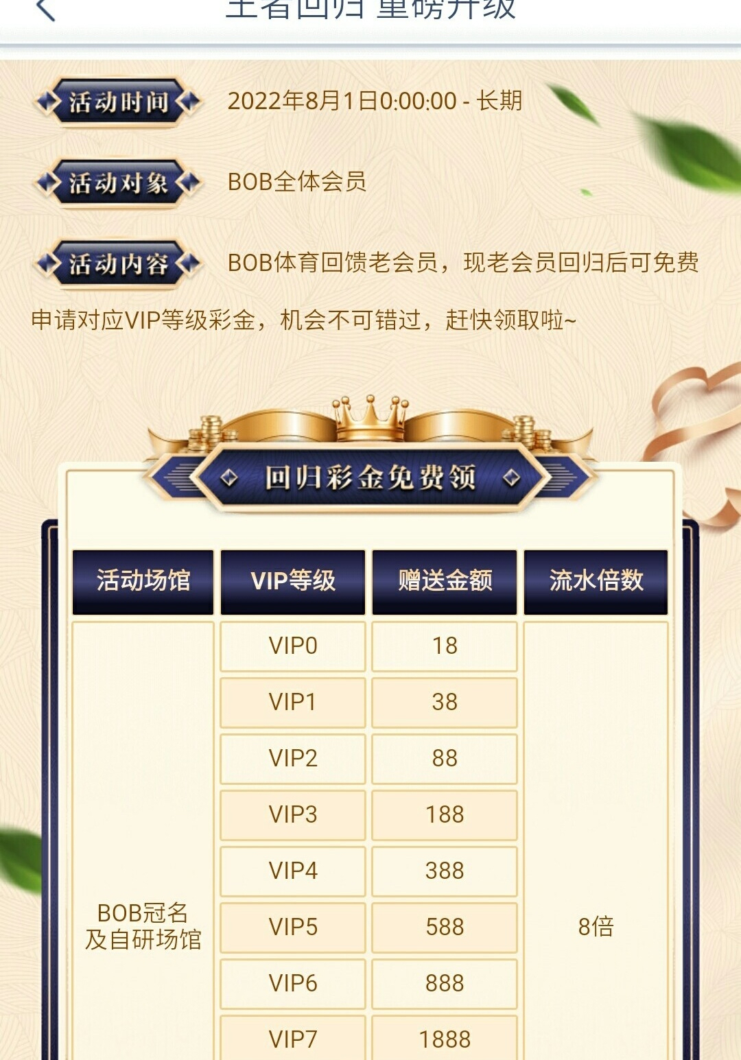 老用户根据vip等级领取/2022全年度回归/即回馈最低18,有账号都去试试,新用户无视