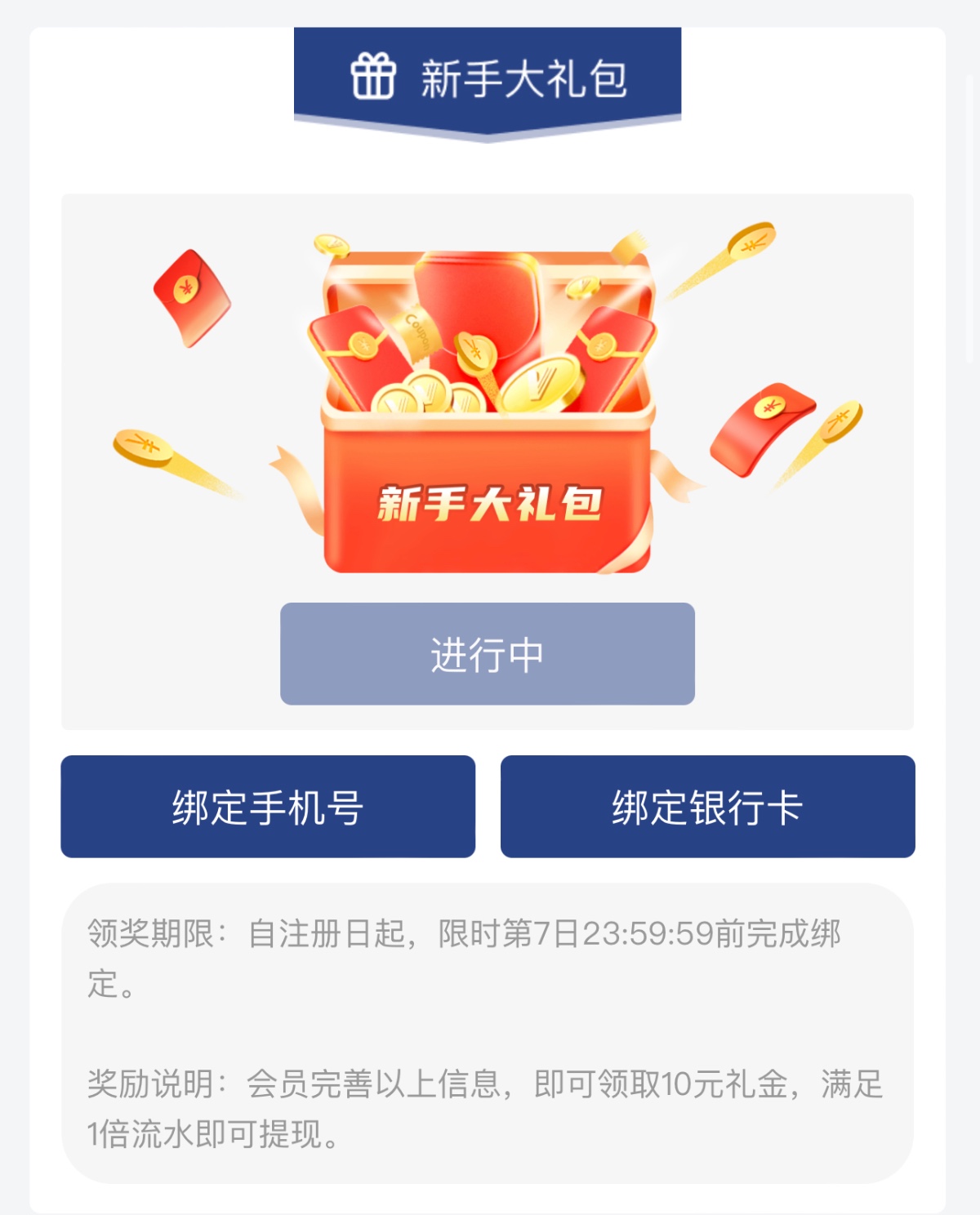 活动:新用户注册绑卡绑手机号 优惠里自助领取10元彩金 无游戏限制 一倍流水 最低提款100元 最高提款188元