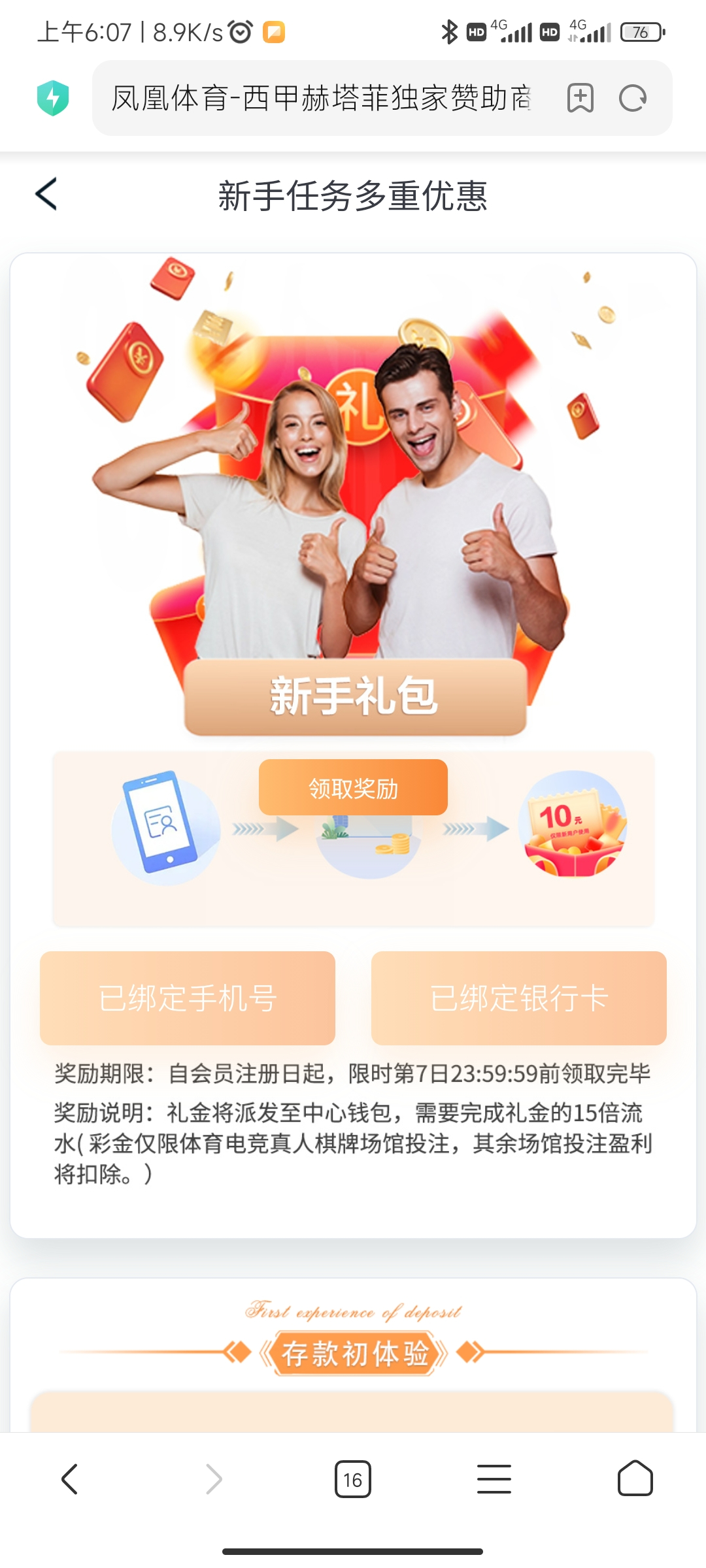 注册绑卡活动新人任务领取10,15倍流水,活动自己看限制。